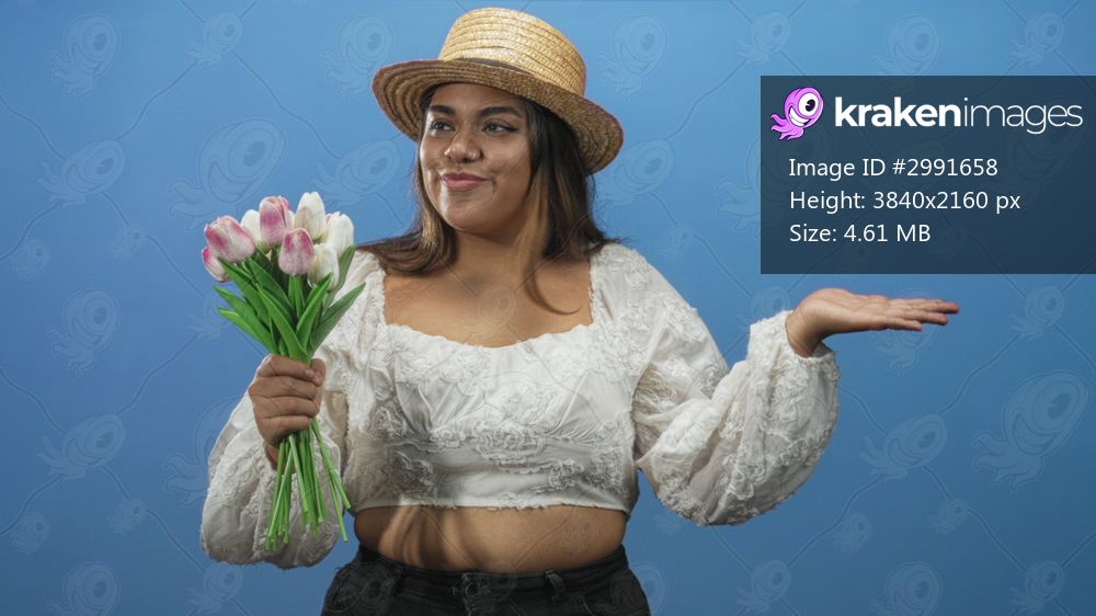 Woman in a sunhat holding a bouquet of tulips with palm up gesture and smiling against a blue studio backdrop; joyful confidence.