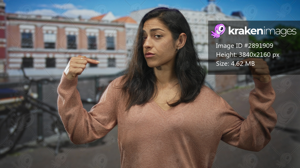 Woman in a tan v neck sweater points finger to chest on city street near canal and historic building; confidence empowerment.