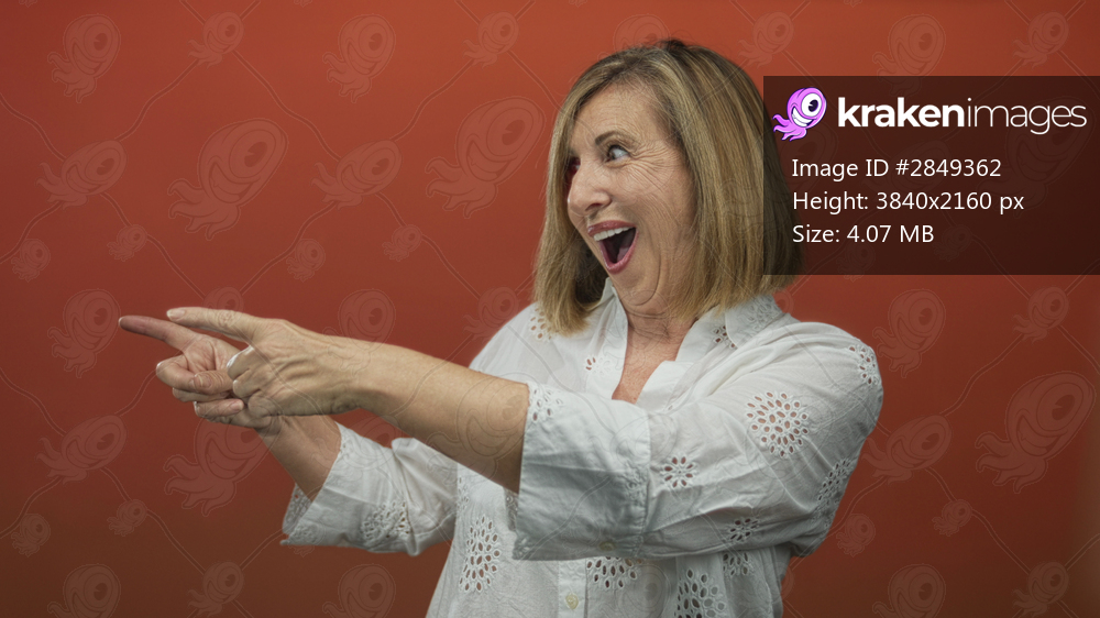 Woman in a white blouse points finger toward unseen target against a red studio wall; joy enthusiasm.