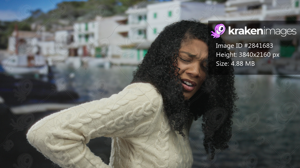 Woman in a white cable knit sweater holds lower back by a building with boats docked ashore beside blue water; discomfort.