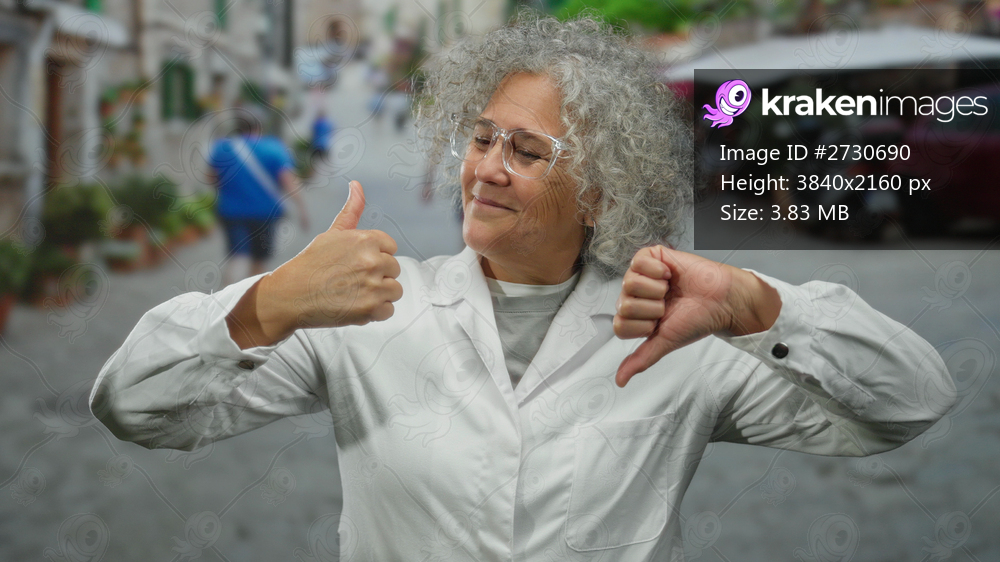 Woman in a white coat with curly grey hair making thumbs up and down gestures on a bustling urban street with blurred background, showcasing diverse public expressions outdoors. - Kraken Images