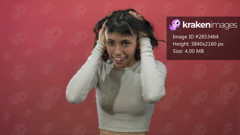Woman in a white cropped top touches her cheeks with both hands in a studio against a red background; happiness.