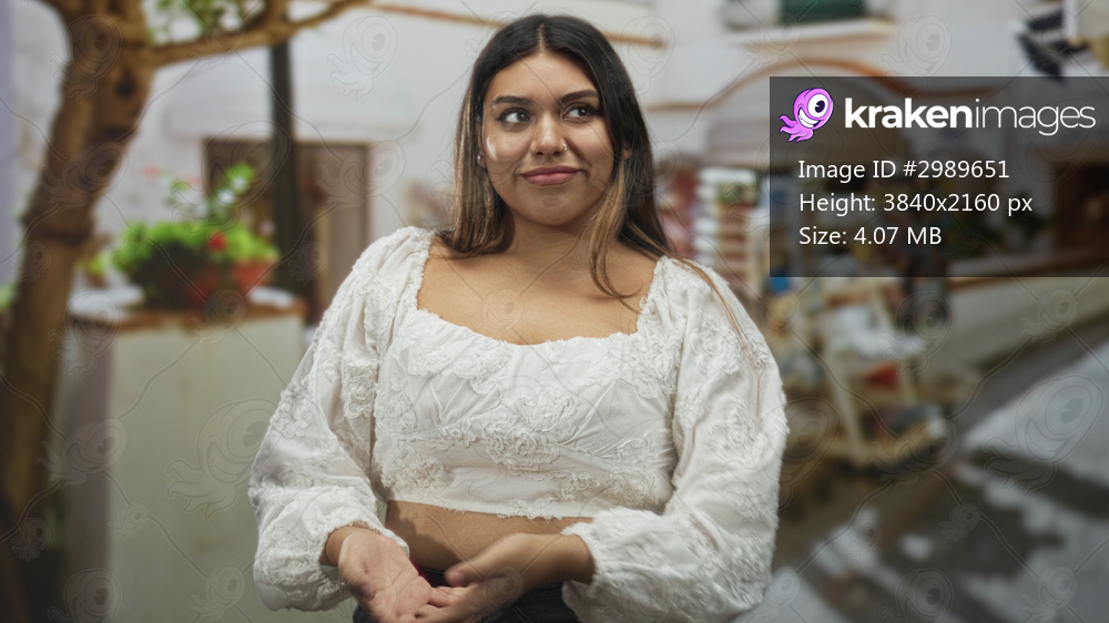 Woman in a white embroidered blouse clasping hands near chest and smiling on a mediterranean street beside a souvenir kiosk and planter; gentle joy.
