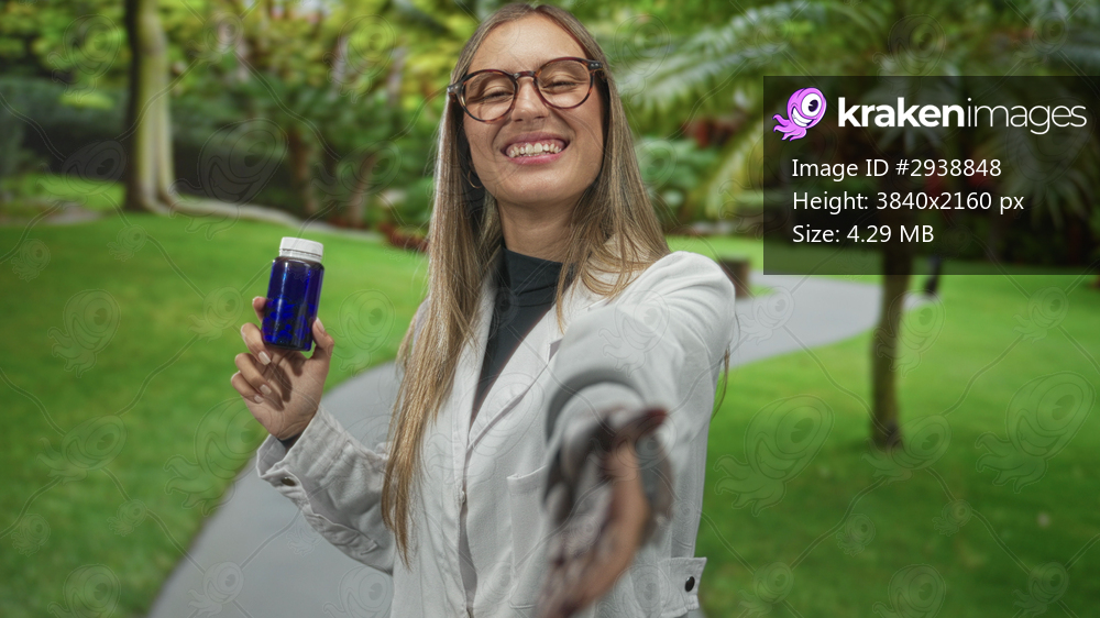 Woman in a white lab coat holding a blue bottle, smiling with hand extended toward camera on a paved path in a forest; wellness confidence.