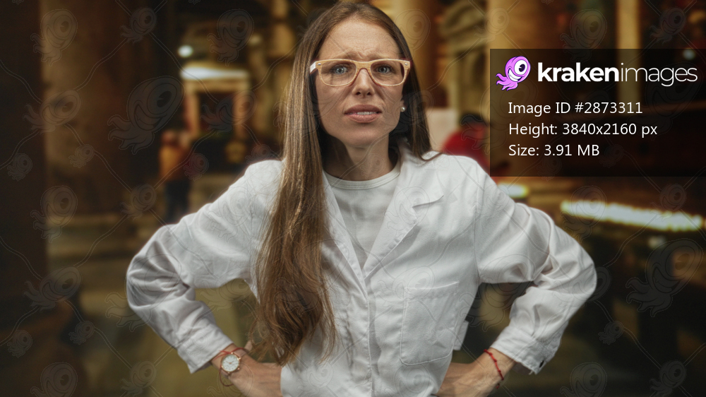 Woman in a white lab coat pressing hands to head and screaming inside a church nave; faith doubt distress.