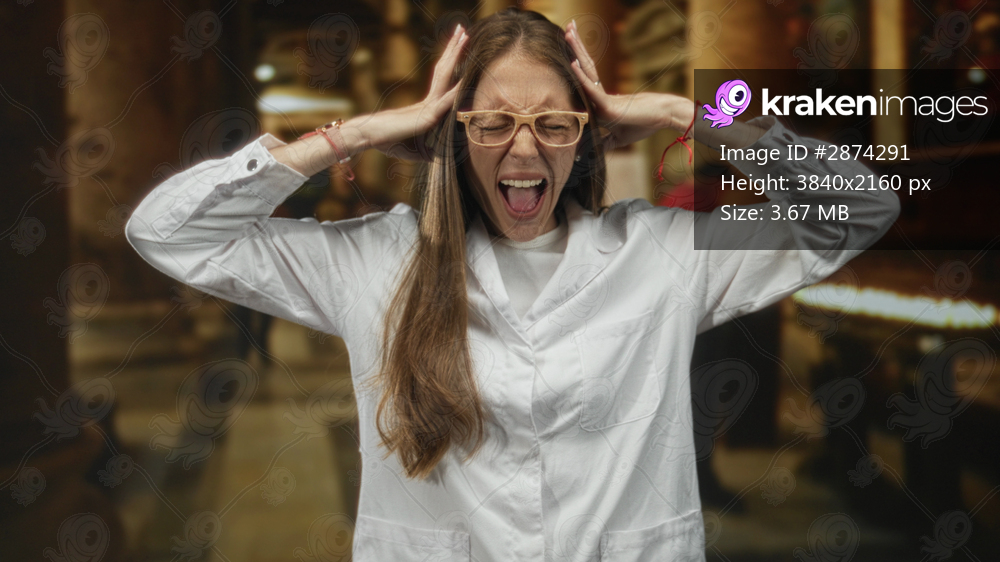 Woman in a white lab coat pressing hands to head and screaming inside a church nave; faith doubt distress.
