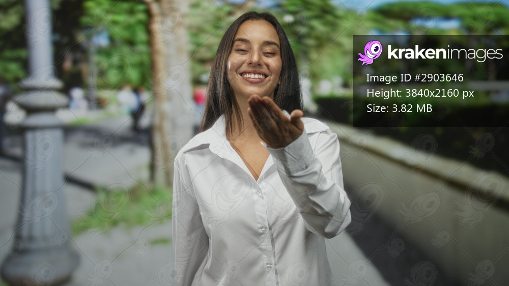 Woman in a white shirt blowing a kiss with outstretched hand on a sunny street while smiling; joy warmth.