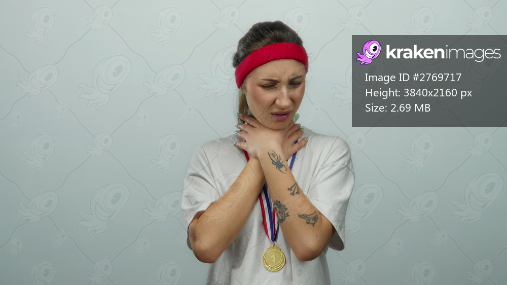 Woman in a white shirt with red headband and medal looks uncomfortable holding her throat against a white background, conveying a sense of discomfort or strain. - Kraken Images
