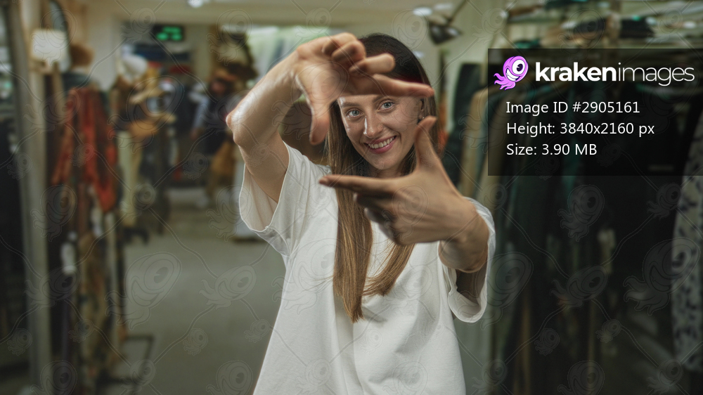 Woman in a white t shirt framing her face with hands and pointing fingers to form a viewfinder in a retail store building; playful curiosity.