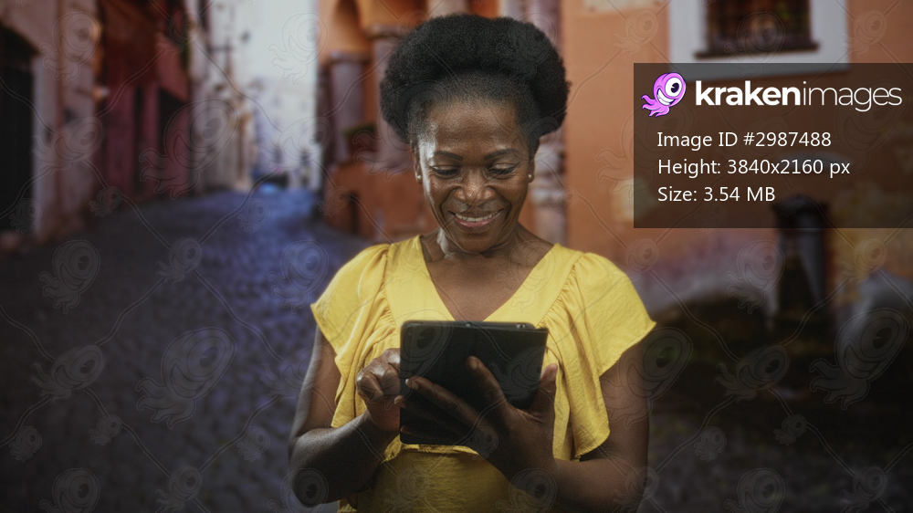 Woman in a yellow blouse holding a tablet with both hands tapping the screen, smiling while standing on a narrow cobblestone street beside an orange building and window; contentment. - Kraken Images