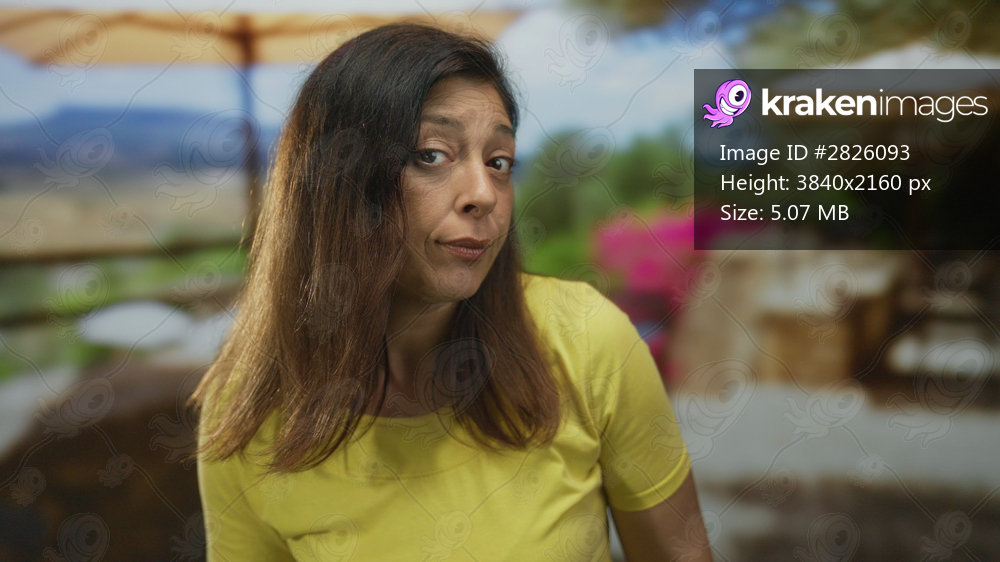 Woman in a yellow shirt tilts head showing bare face against blurred umbrella and bougainvillea blossoms on a building terrace; calm contemplation.