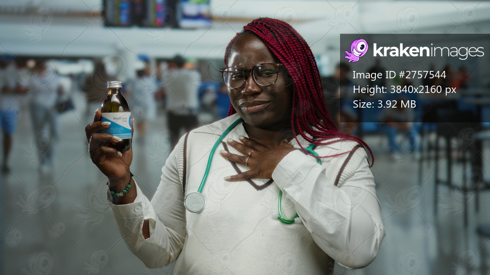 Woman in airport holding medicine bottle with throat pain expression, surrounded by travelers, wearing stethoscope, implying health concerns in busy terminal setting. - Kraken Images