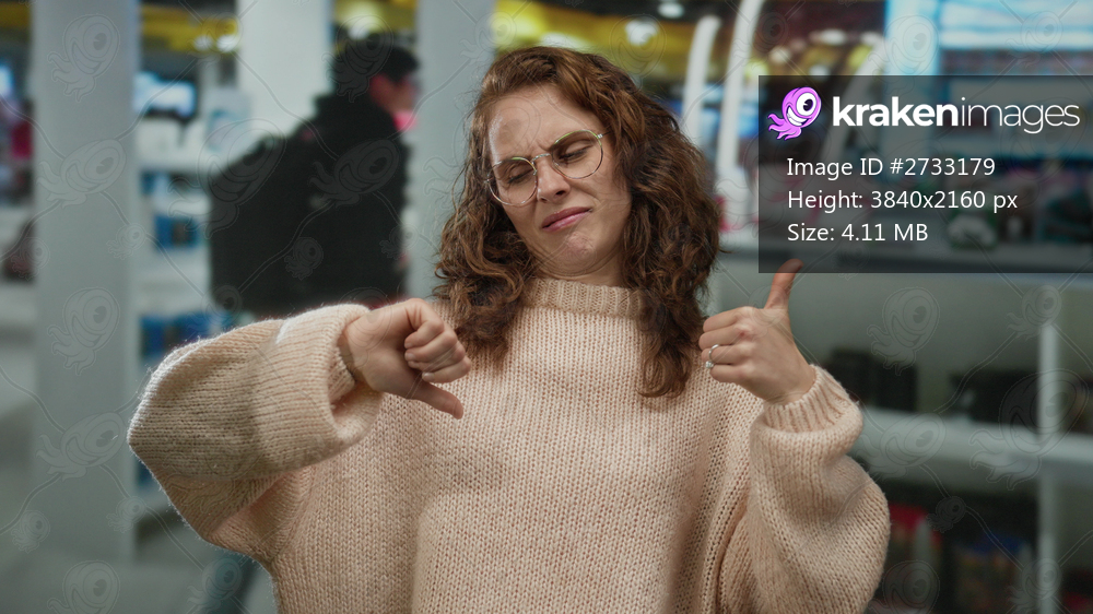 Woman in airport terminal with glasses and curly hair gestures with thumbs up and down while wearing a sweater indoors, suggesting indecision or mixed emotions. - Kraken Images