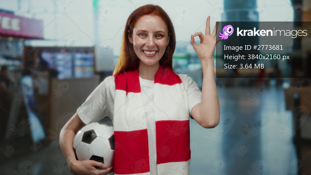 Woman in airport terminal holding soccer ball with red scarf smiles confidently indoors capturing joyful travel spirit and passion for sports showing positive gesture.