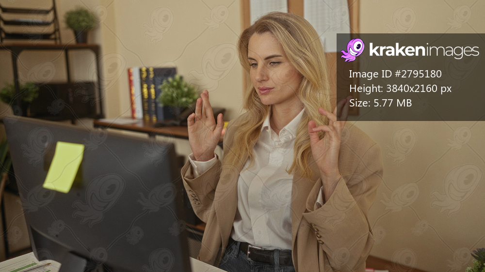 Woman in an office celebrates success with fingers crossed while sitting at a desk in a workplace surrounded by books and plants.