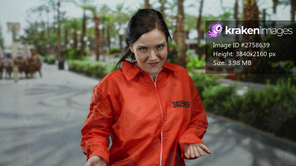 Woman in an orange jumpsuit smiles outdoors on a sunny street with palm trees in the background.