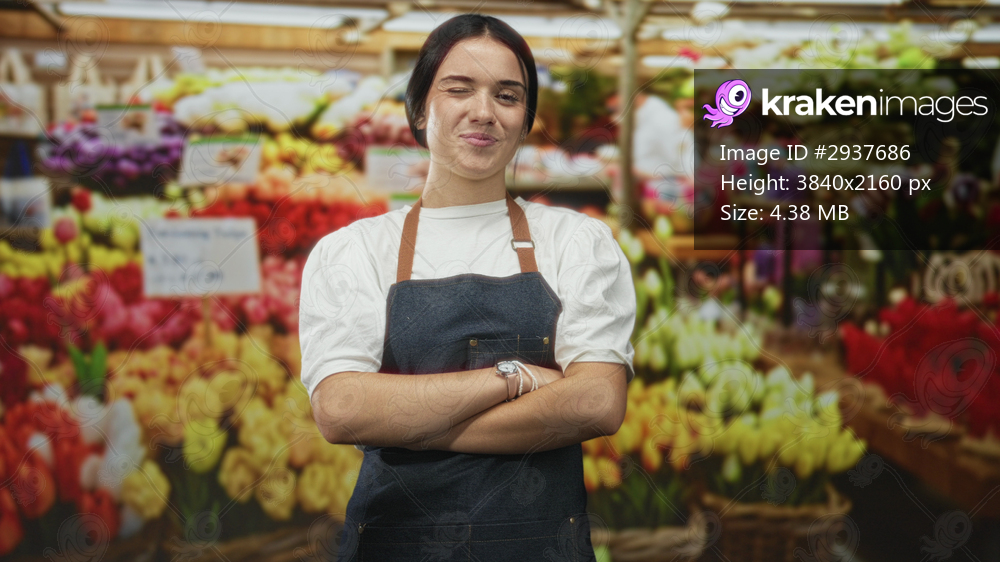 Woman in apron with arms crossed smiling among tulips and baskets in a building flower market; confident friendly service.