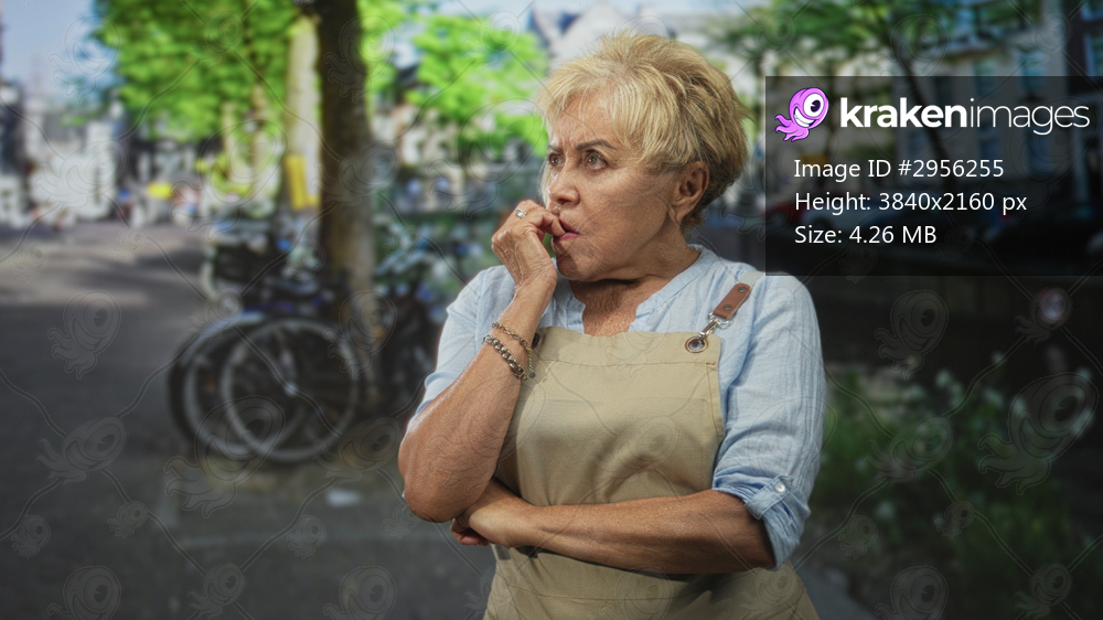 Woman in apron biting fingernail with hand to mouth on a street lined with bicycles and canal buildings; anxiety concern.