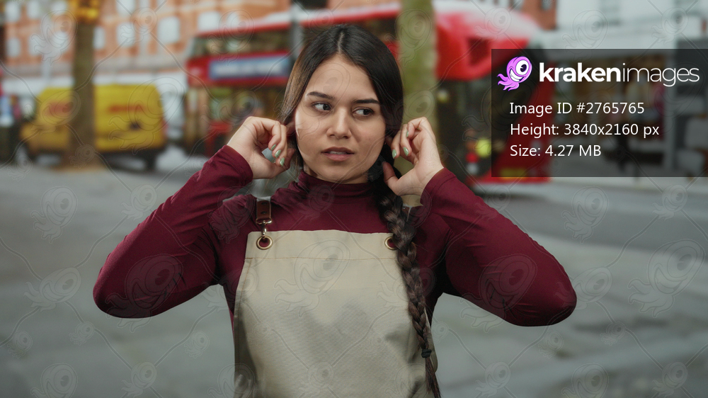 Woman in apron with closed eyes covers her ears on bustling city street featuring iconic red bus and urban backdrop.