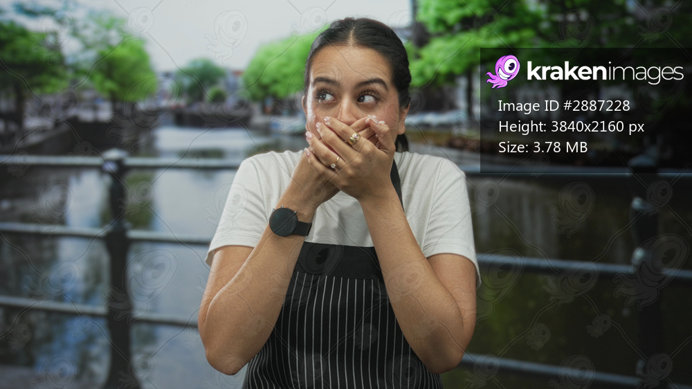 Woman in apron covers mouth with both hands on a canal street in amsterdam by the water and bridge, eyes wide in shock; surprise.