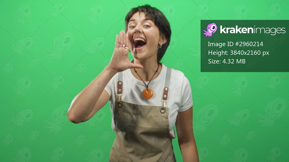 Woman in apron cups hands to shout with mouth open and rings visible in studio; joyful announcement.