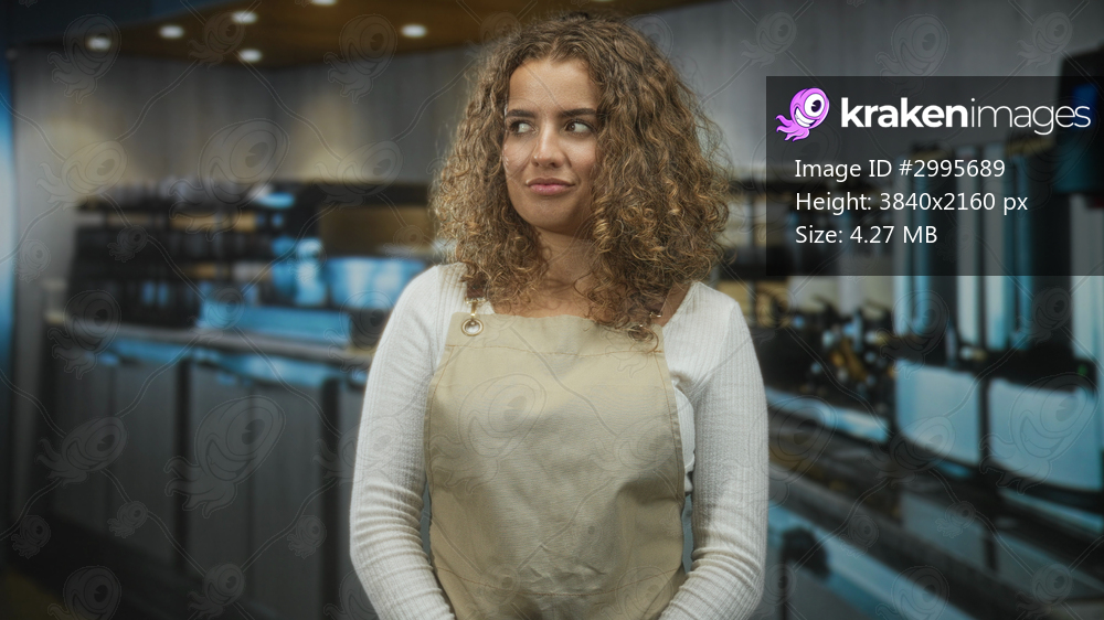 Woman in apron with curly hair standing with hands loosely clasped, looking to side at espresso machines and cafe counter in building; warm hospitality calm. - Kraken Images
