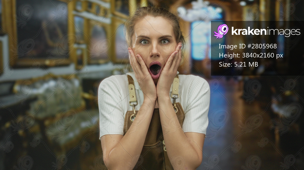Woman in apron expresses surprise in a museum setting with paintings on the walls.