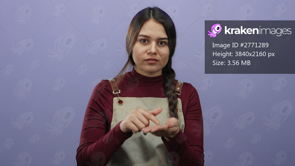 Woman in apron gestures for payment against isolated purple background in expressive stock image showing waitress waiting for money with focused demeanor and casual attire. - Kraken Images