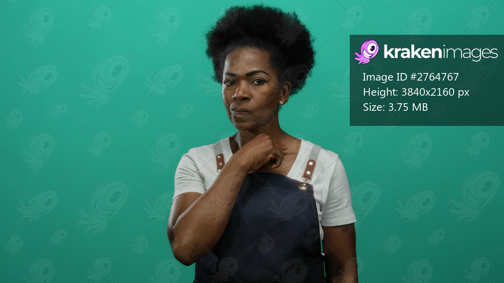 Woman in apron gestures vigilance and threat against isolated green background, expressing assertive communication through expressions and hand signs with an intense focus. - Kraken Images