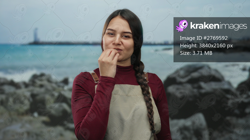 Woman in apron gesturing near seaside with rocks and ocean in background, embracing nature while smiling in outdoor setting on a sunny day at the beach. - Kraken Images