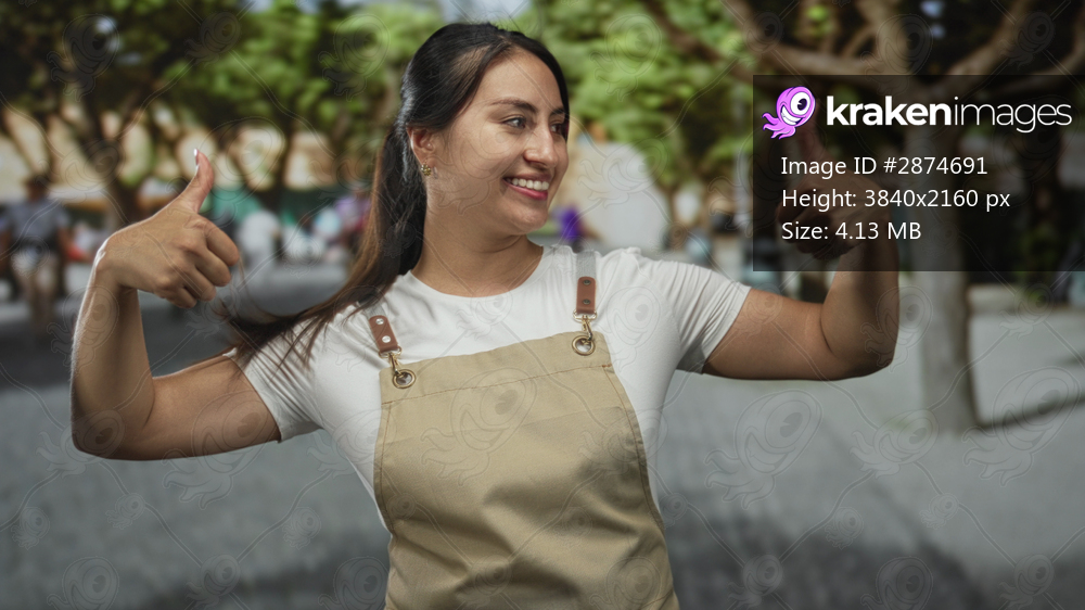 Woman in apron gives thumbs up on a street plaza with trees, bench and blurred crowd while smiling and showing arm; joy confidence.