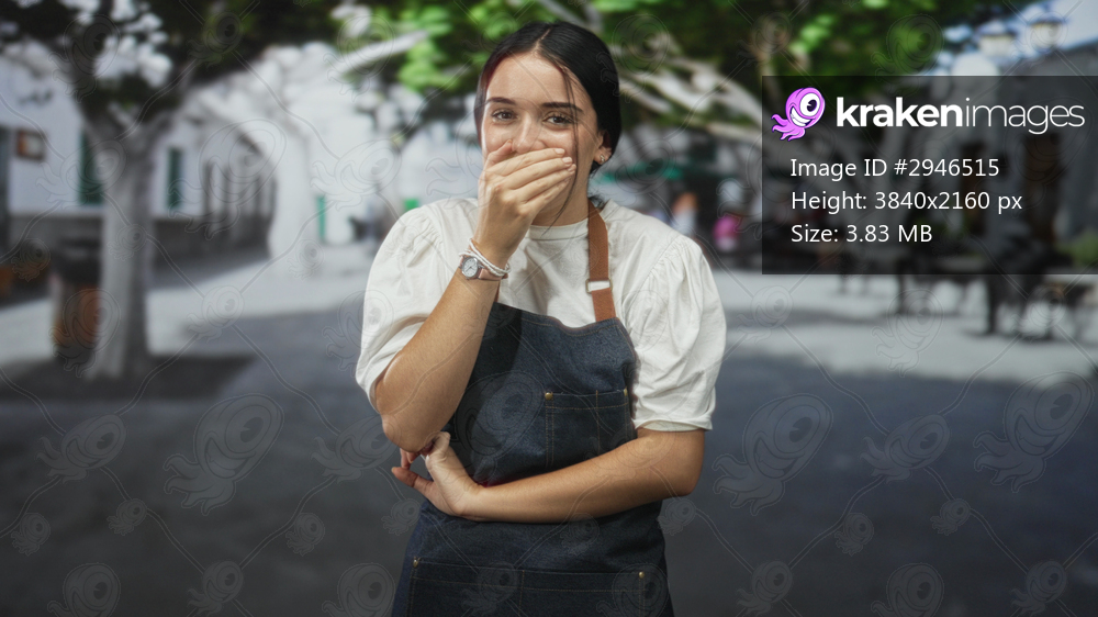 Woman in apron with hand covering mouth and folded arm, standing in a tree lined street cafe; surprise, quiet reflection.