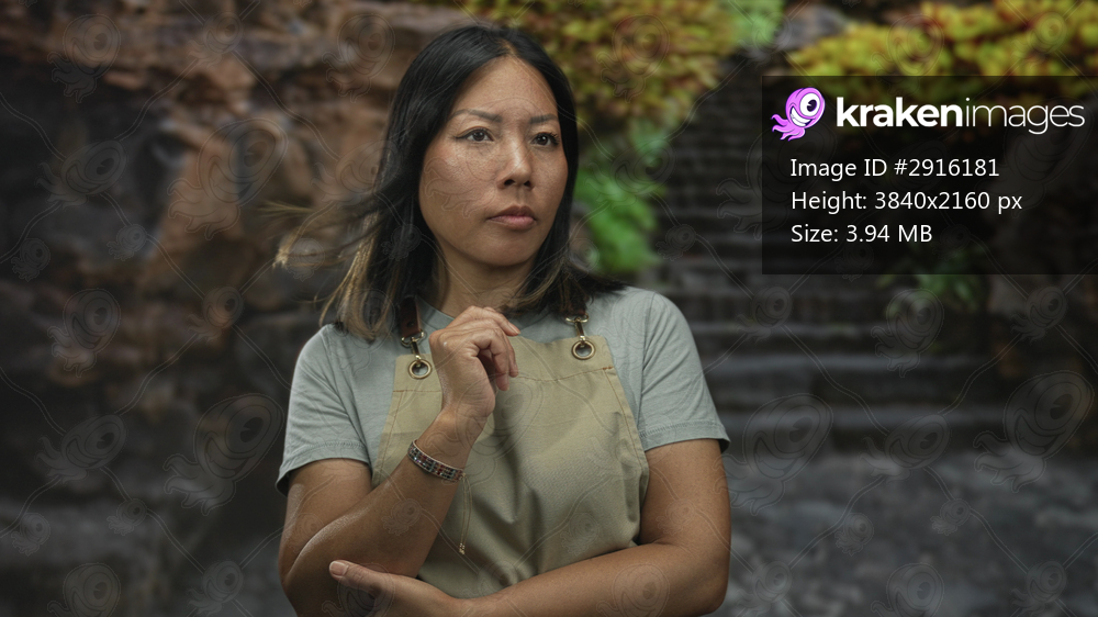 Woman in apron with hand on chin and crossed forearms by stone steps in forest setting outdoors; quiet contemplation.