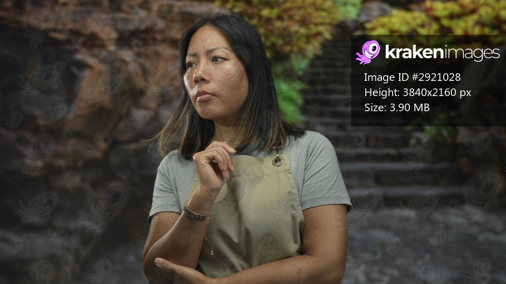Woman in apron with hand on chin and crossed forearms by stone steps in forest setting outdoors; quiet contemplation.