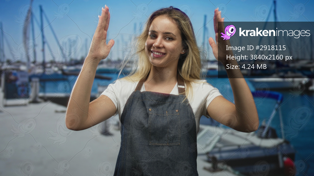 Woman in apron hands raised palms visible at studio pier with docked boats and marina harbor; joy small business.