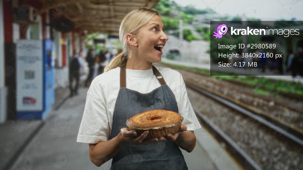 Woman in apron holding a sponge cake with both hands, mouth open looking right on a train station platform inside building; surprise hospitality.