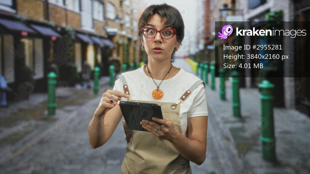 Woman in apron holding a tablet and touching a round pendant necklace while glancing to the side on a cobblestone street lined with storefronts; curiosity planning. - Kraken Images