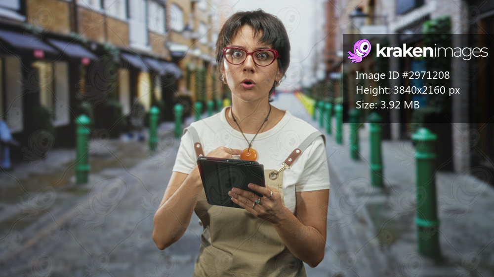 Woman in apron holding a tablet and touching a round pendant necklace while glancing to the side on a cobblestone street lined with storefronts; curiosity planning. - Kraken Images