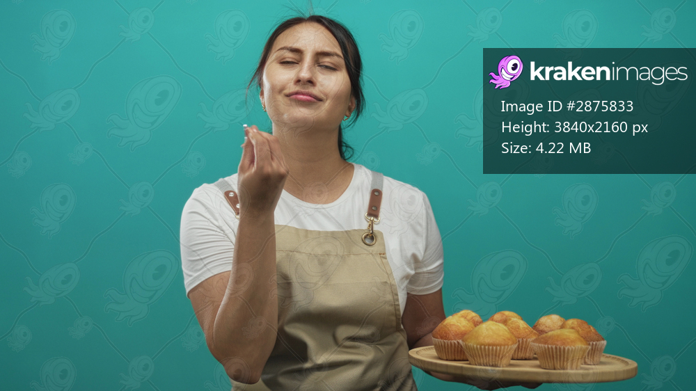 Woman in apron holding a tray of muffins and beckoning with her hand in a teal studio; hospitality pride.