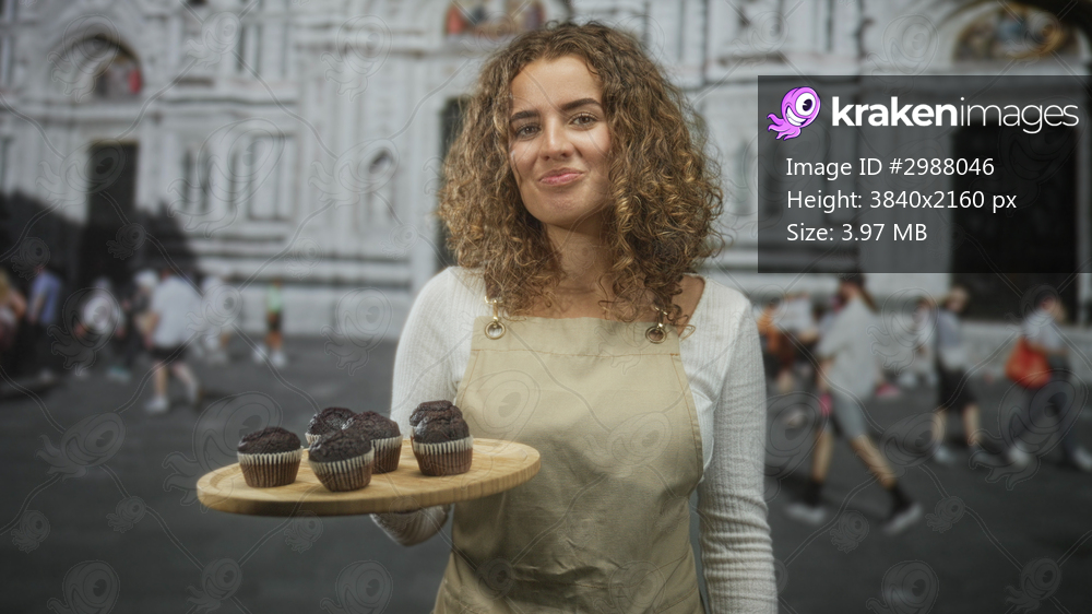Woman in apron holding a wooden tray of chocolate muffins while smiling toward camera on a busy street with blurred pedestrians and cathedral facade; artisan baking warmth. - Kraken Images