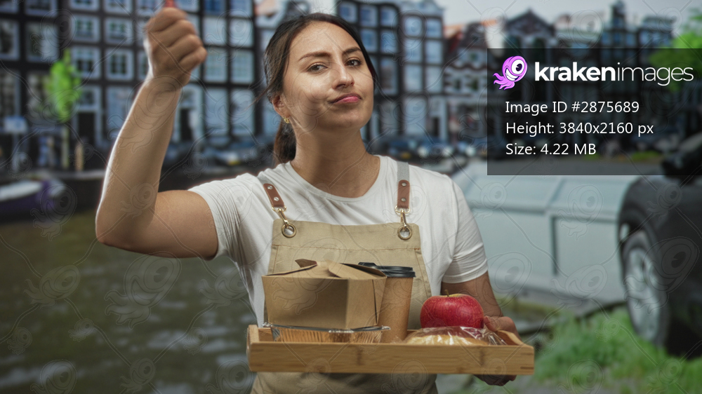 Woman in apron holding a wooden tray with takeaway coffee, boxed lunch and apple shrugs on street in amsterdam; service frustration.