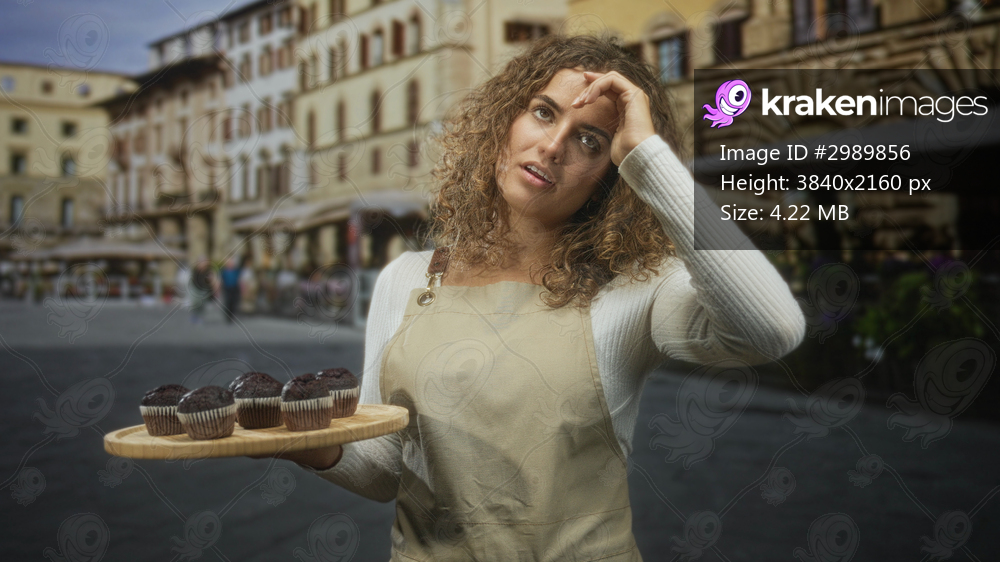 Woman in apron holding chocolate muffins on a wooden tray touches forehead on cobblestone street; quiet contemplation.