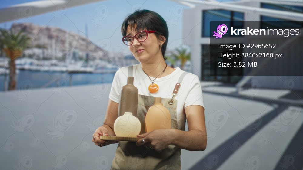 Woman in apron holding handcrafted pottery vases on a wooden tray, hands presenting in a studio; craft pride.