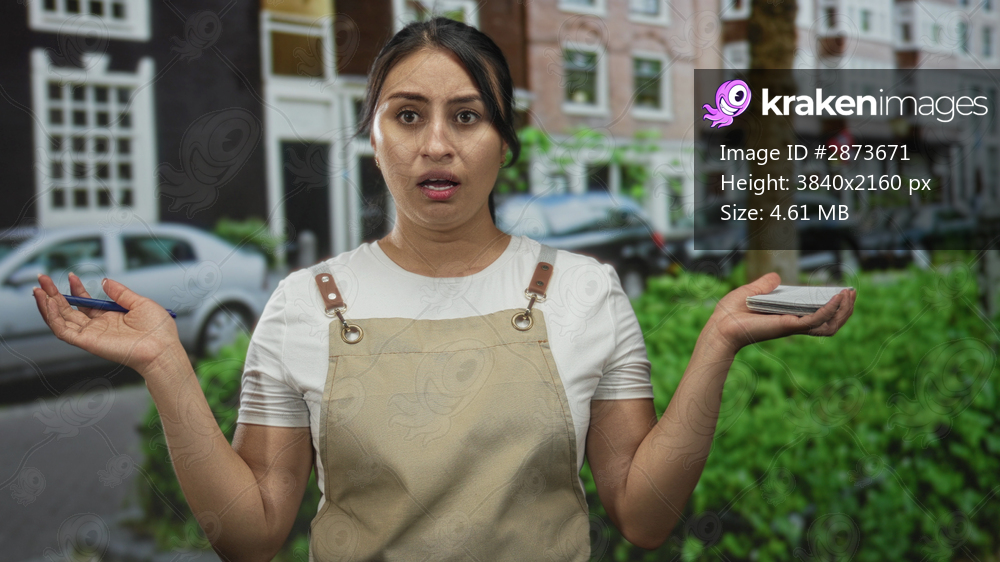 Woman in apron holding notepad and pen with hands raised and finger to lips on street; surprise dilemma.