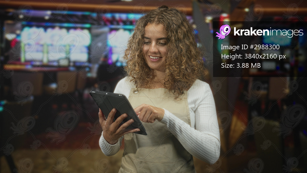 Woman in apron holding tablet and giving thumb up while tapping screen and smiling amid slot machines inside casino building; cheerful service.