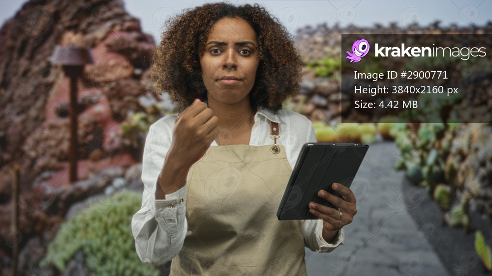 Woman in apron holding tablet and making fist gesture on paved street lined with succulents and rocks; small business determination.
