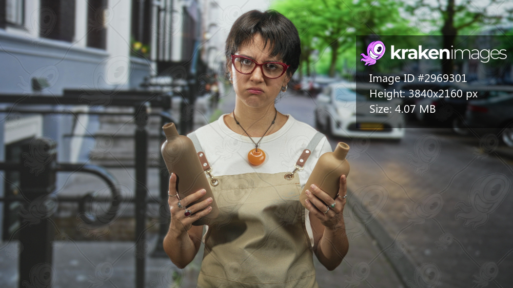 Woman in apron holding two pottery bottles with both hands and frowning, short hair and red glasses on a city street; creative frustration.