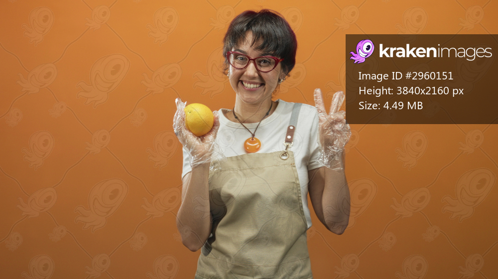 Woman in apron holds a grapefruit while wearing disposable gloves and shows a peace sign in studio with orange backdrop; cheerful freshness.