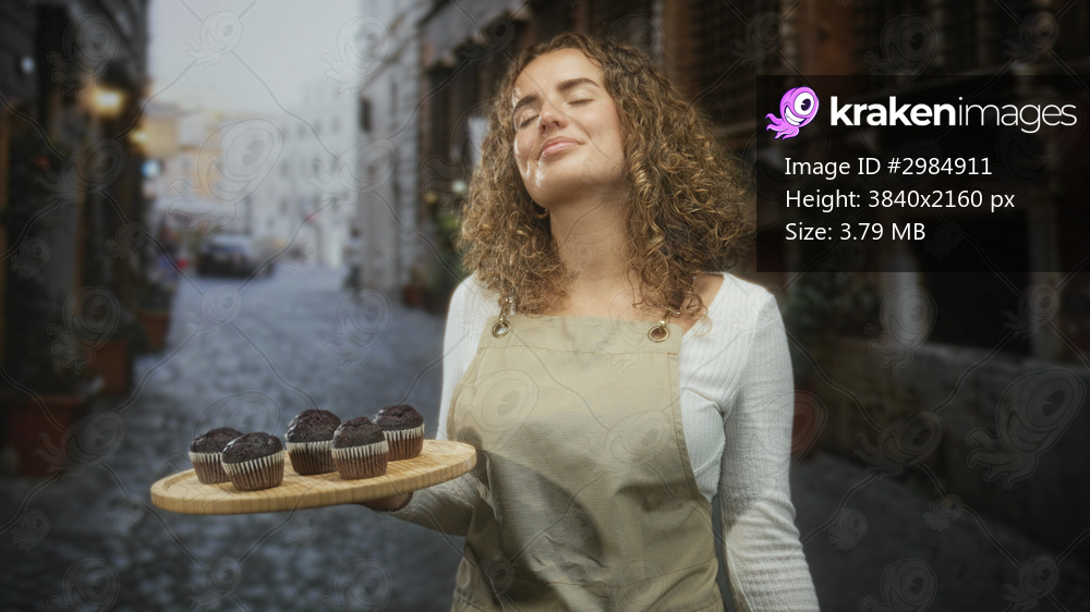 Woman in apron holds a wooden tray of chocolate muffins, smelling aroma with eyes closed on a cobblestone street; warm homemade contentment.