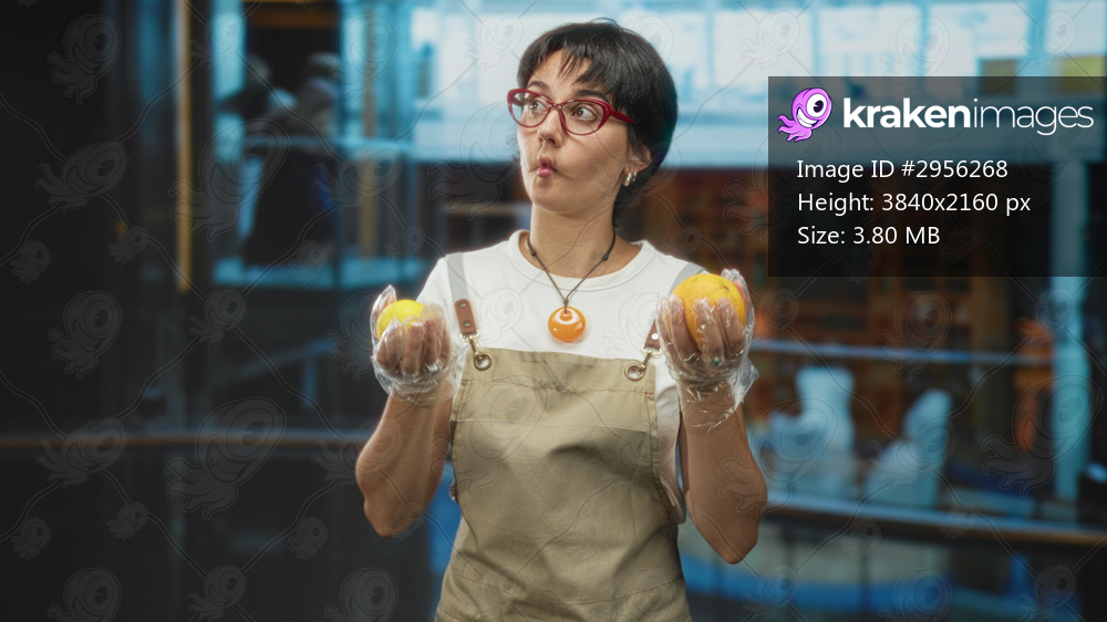 Woman in apron holds an orange and a lemon with gloved hands, smiling and offering fruit in a shopping mall building; cheerful hospitality.